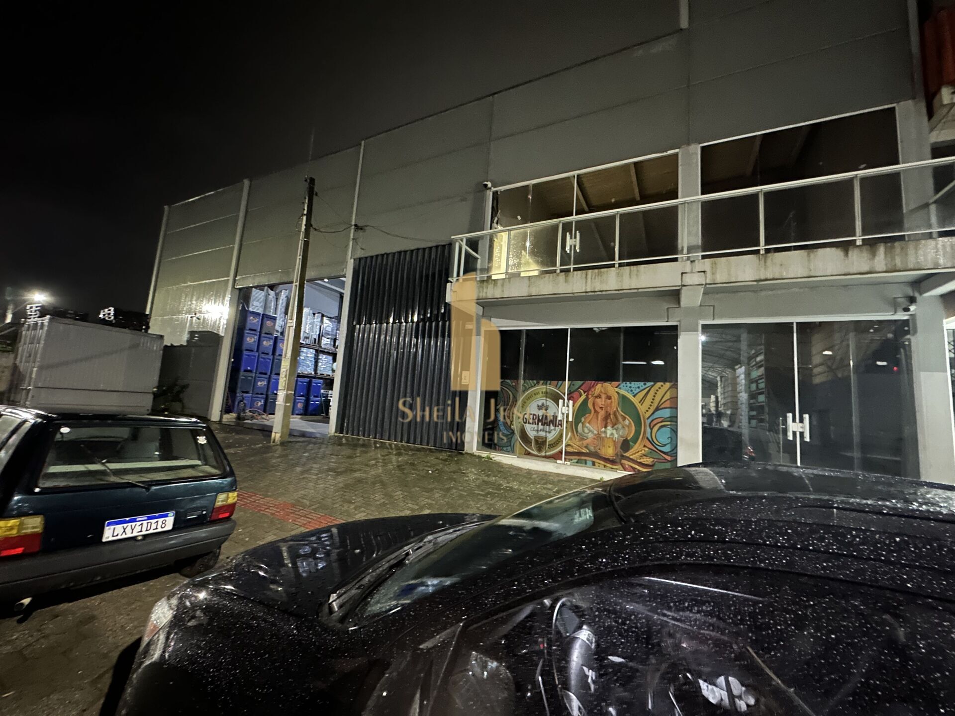 Portão bipartido, tem fachada envidraçada e escadaria para escritório, administração ou depósito que pode ficar no segundo piso (mezanino).